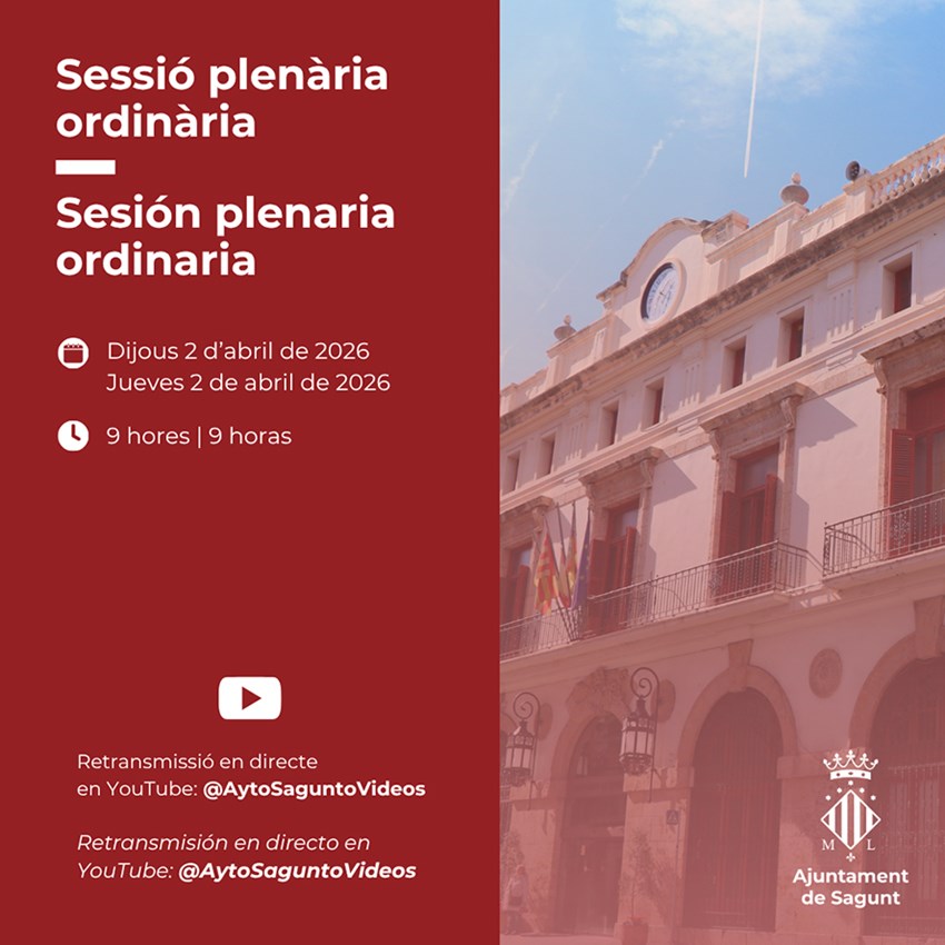 La sesión la retransmitirá en directo el Gabinete de Comunicación del Ayuntamiento, de modo que la ciudadanía, los medios de comunicación y las personas interesadas la podrán seguir a través del canal oficial de YouTube del Ayuntamiento de Sagunto y en las redes sociales que gestiona el Gabinete: Facebook, Instagram y X (antes Twitter).