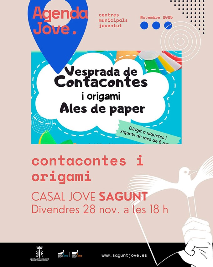 El Casal Jove Sagunto celebra la jornada Ales de paper, una tarde de cuentacuentos y origami que tendrá lugar el viernes 28 de noviembre a las 18 horas. La dinámica se dirige a niños y niñas de más de seis años.