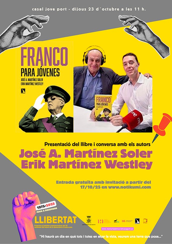 El escritor Erik Martínez Westley presenta el libro Franco para jóvenes junto a su padre, el periodista José Antonio Martínez Soler. La presentación será el jueves 23 de octubre a las 11 horas en el salón de plenos del Casal Jove de Puerto de Sagunto. A pesar de que la actividad está dirigida al alumnado de secundaria, las personas interesadas en asistir pueden reservar su plaza a través de Internet.