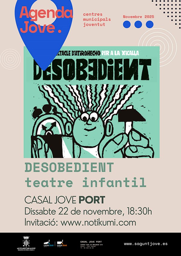 La compañía Atirohecho representa la obra de teatro infantil Desobedient el sábado 22 de noviembre a las 18:30 horas en el Casal Jove Puerto de Sagunto.