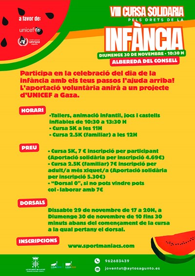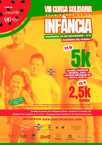 El departamento de Juventud e Infancia del Ayuntamiento de Sagunto organiza para el domingo 30 de noviembre la VIII Carrera Solidaria por los Derechos de la Infancia, un evento familiar abierto a toda la ciudadanía.