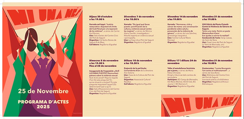 La programació municipal del 25N comença hui mateix amb una xarrada-col·loqui en la qual es reflexiona sobre què entenem per Justícia des del Feminisme, a càrrec de la presidenta del Grup Europeu de Magistrades per a la Mediació (GEMME Espanya) Carme Guil (19 hores – Centre Cívic Antic Sanatori). La sala d'exposicions d'este edifici municipal del Port de Sagunt albergarà fins al 28 de novembre ¿Qué llevabas puesto? Desmontando patrones sobre la violencia sexual, una impactant exposició que s'inaugura el dimecres 5 de novembre a les 19 hores. La investigadora i filòsofa Mónica Alario desenvoluparà la xarrada Da igual qué lleves puesto: pornificación de la cultura y violencia sexual contra las mujeres a la Casa Lila (7 de novembre – 18 hores).