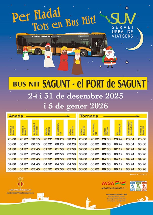 El departament de Mobilitat Urbana de l'Ajuntament de Sagunt i l'empresa que presta el servici de transport públic i de Bus Nit en el municipi, AVSA, han fet públics els horaris ampliats per a les principals nits de les festes de Nadal: Nit de Nadal, Nit de Cap d'Any i Nit de Reis (24 i 31 de desembre i 5 de gener, respectivament).