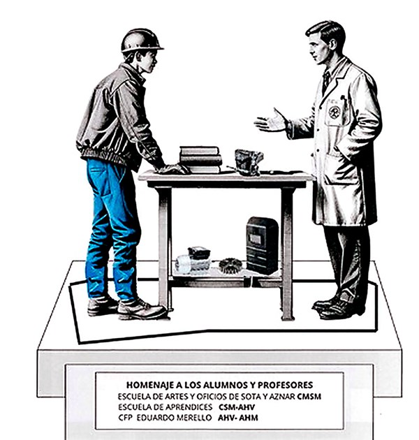 La primera de les quals consistix en un grup escultòric representant a un mestre (1,90 m) i un aprenent (1,75 m) entorn d'una taula amb elements de treball, simbolitzant la transmissió de coneixement, l'esbós del qual ha sigut elaborat per un grup d'alumnes de la Escuela de Aprendices dels anys 70. La segona escultura, amb unes dimensions de mig metre d'altura per 1,10 m d'amplària, estarà basada en una maqueta de l'Asociación de Amigos de la Escuela de Aprendices, i representarà l'edifici derruït fa més de tres dècades.