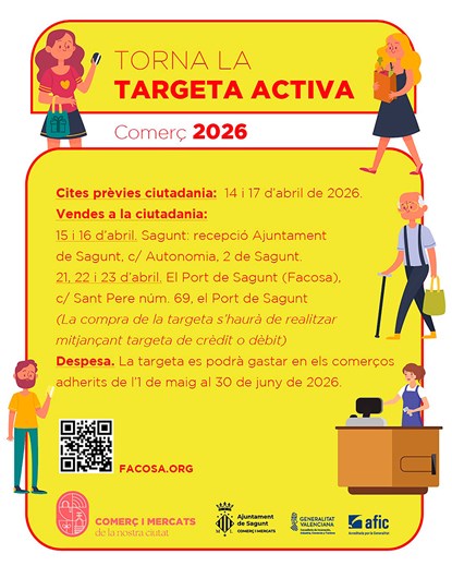 Amb la nova edició del programa Targeta Activa Sagunt Comerç 2026, la Regidoria de Comerç i Mercats repartirà 2.000 targetes entre la ciutadania per a continuar fomentant el consum de proximitat i dinamitzant el teixit comercial de la ciutat. Cal esmentar la col·laboració de FACOSA en esta iniciativa organitzada per l'Ajuntament de Sagunt en la qual en esta ocasió només s'emetran targetes per a comprar en establiments comercials adherits a la campanya.