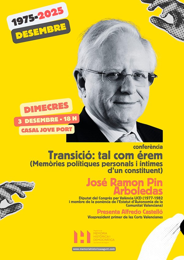 La Regidoria de Memòria Històrica i Democràtica de l'Ajuntament de Sagunt organitza la conferència Transició: tal com érem (Memòries polítiques personals i íntimes d'un constituent), que serà impartida per José Ramón Pin Arboledas.