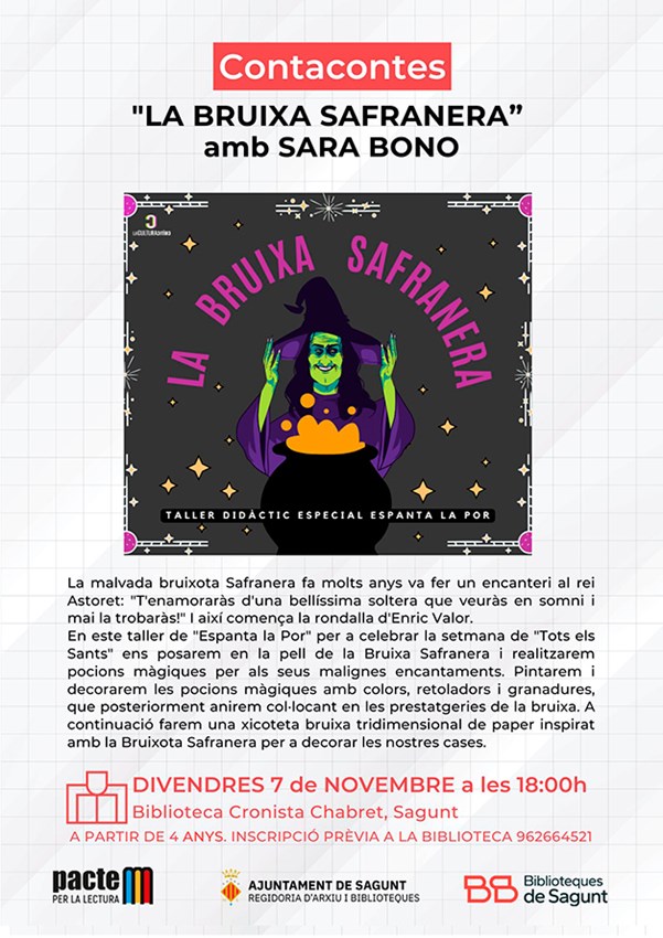 La contacontes Sara Bono representarà 'La bruixa safranera' divendres que ve 7 de novembre a les 18 hores a la biblioteca Cronista Chabret de Sagunt. Les persones interessades a assistir a este taller didàctic especial per a espantar la por dirigida a xiquets i xiquetes a partir de quatre anys cal inscriure's telefonant al 962664521.