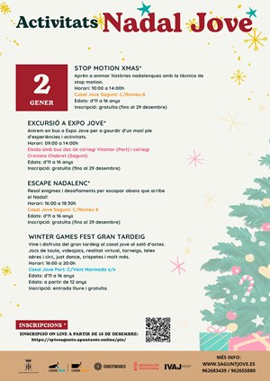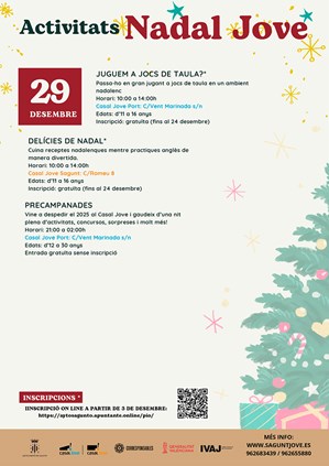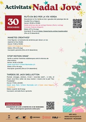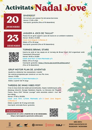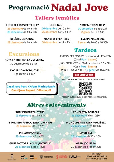 El Departament d'Infància i Joventut de l'Ajuntament de Sagunt presenta Nadal Jove, una programació amb més de 25 activitats d'oci educatiu, cultural i esportiu dirigides a jovens d'entre 11 i 30 anys. Les propostes es desenvoluparan entre el 20 de desembre i el 2 de gener de 2026 en els Casals Jove de Sagunt i el Port de Sagunt, així com en altres espais municipals.