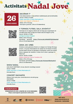 Entre les activitats especials s'inclou el Gran Joc Urbà, una gymkhana participativa que convida a les persones joves a recórrer la ciutat i resoldre diferents reptes, així com les precampanades Joves, una proposta festiva per a acomiadar l'any amb activitats, música i sorpreses en un entorn segur i juvenil.