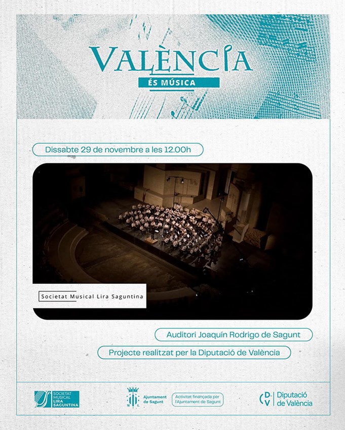 La pel·lícula Lira Saguntina - Valencia es Música es projectarà el dissabte 29 de novembre a les 12 hores a l'Auditori Joaquín Rodrigo, un homenatge a la ciutat i la societat saguntina realitzat per la Diputació de València.