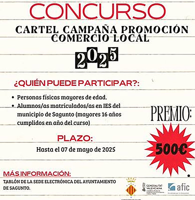 Un año más, el Ayuntamiento de Sagunto, a través de la Concejalía de Comercio y Mercados, abre el plazo para participar en el concurso del cartel de la campaña de promoción del comercio local, cuyo premio es de 500 €. El plazo acabará el 7 de mayo y las personas interesadas pueden acceder a la información necesaria a través de la web del Ayuntamiento.