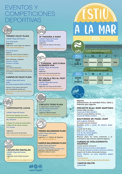 El programa de este verano de 2025 incluye, como siempre, diversas competiciones deportivas, campus estivales, clases para adultos y actividades náuticas. Entre las actividades se cuentan cuatro torneos y un campus de voley playa; dos campeonatos de lucha; la 9ª Travesía a Nado; la mítica 57ª Volta a Peu al Port de Sagunt; un circuito de tenis playa; un torneo y un campus de balonmano playa; clases de yoga y gimnasia; y actividades náuticas como el Projecte Blau de surf adaptado, bautismos de pádel surf, cursos de deslizamiento acuático y el tradicional Campus Delfín.
