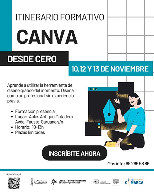 La programación formativa del área de Promoción Económica también incluye la segunda edición de Canva desde cero, un curso presencial de 9 horas de duración con el que aprender a dominar esta herramienta de diseño gráfico de manera práctica y sencilla. Este curso está programado el 10, 12 y 13 de noviembre entre las 10 y las 13 horas en el nuevo aulario del antiguo matadero. Las personas asistentes a la formación deberán llevar a las clases un ordenador portátil. Si le interesa participar en este itinerario formativo puede inscribirse a través de este formulario en línea.