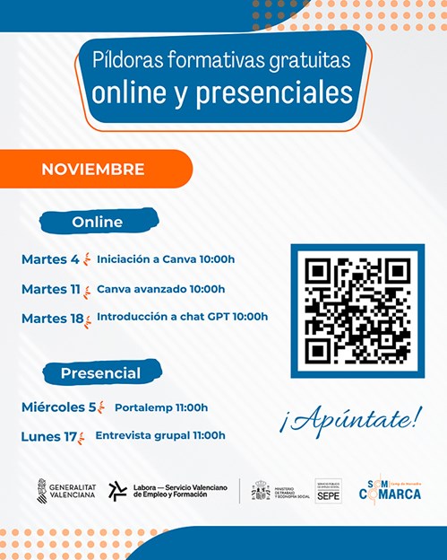 Cabe destacar también dos sesiones formativas que se llevarán a cabo de manera presencial en el nuevo aulario del antiguo matadero (av. Fausto Caruana s/n, junto a las oficinas de la SAG de Puerto de Sagunto): Portalemp (5 de noviembre – 11 horas) y Entrevista grupal (17 de noviembre – 11 horas).
