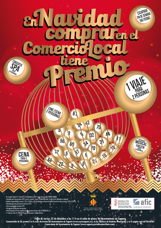 La campaña En navidad comprar en el comercio local tiene premio repartirá 655 premios valorados por un total de 15.555 euros durante las fiestas navideñas. Esta campaña creada por la delegación de Comercio del Ayuntamiento de Sagunto pretende dinamizar el comercio del municipio durante la campaña navideña con la finalidad de impulsar las compras en estas fechas, según ha informado el concejal de Comercio, Sergio Moreno, en rueda de prensa.