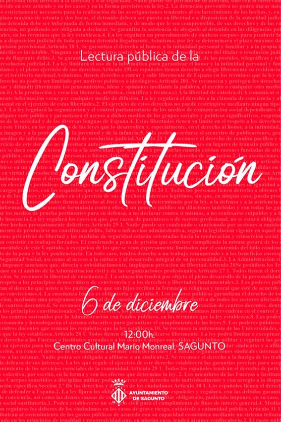 El Ayuntamiento de Sagunto invita a la ciudadanía a participar en el Día de la Constitución en una lectura pública de la Carta Magna a cargo de niños y niñas del municipio. El acto tendrá lugar el martes 6 de diciembre, a partir de las 12.00 horas, en el Centro Cultural Mario Monreal de Sagunto.