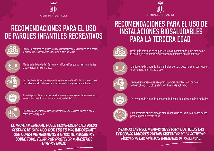 En el caso de los parques con instalaciones biosaludables para la tercera edad, se deben seguir las mismas recomendaciones; realizar las actividades en grupos reducidos, mantener la distancia, asegurar la desinfección de cada persona y utilizar la mascarilla durante la realización de la actividad. Además, hay que tener en cuenta que está prohibido que niños y niñas hagan uso de las instalaciones de los parques para la tercera edad. Todas estas recomendaciones también estarán disponibles en todos los parques, en los que se han instalado carteles informativos.