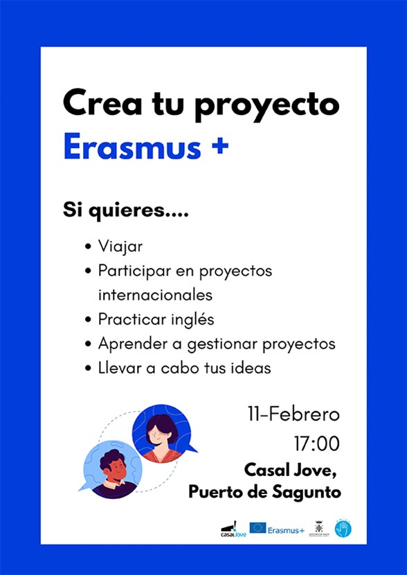 La concejalía de Juventud e Infancia del Ayuntamiento de Sagunto organiza en el Casal Jove de Puerto de Sagunto una charla informativa sobre los intercambios juveniles grupales del programa Erasmus+. Está dirigida para jóvenes en general, o particularmente para aquellos interesados en realizar un intercambio europeo.