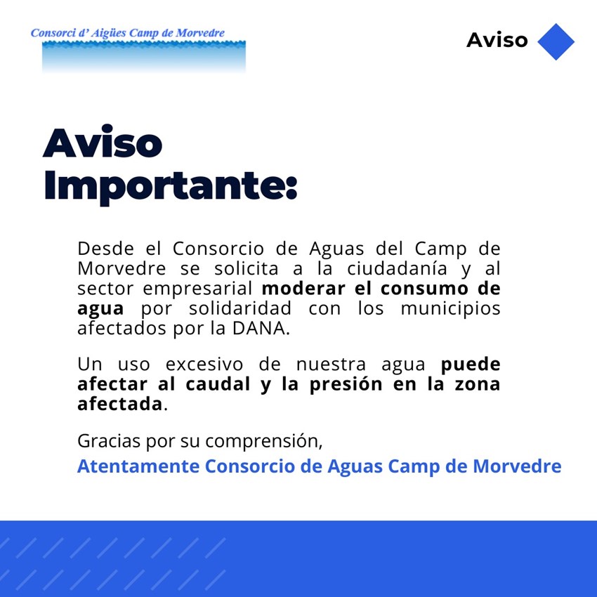 El Consorcio de Aguas del Camp de Morvedre ha recomendado a la ciudadanía y a las empresas moderar el consumo de agua para garantizar un suministro suficiente a las poblaciones afectadas por la DANA. Todos los partidos que integran la Corporación Municipal han secundado la recomendación y han pedido al vecindario de la ciudad “comprensión y colaboración” con las ciudades y pueblos afectados.