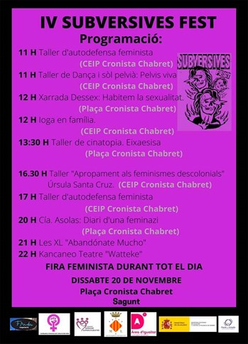 El IV Festival Subversives se aplaza por la previsión de lluvia. Esta actividad, enmarcada en la programación de actos del 25N, está organizada por Amigas Supervivientes, Coordinadora Feminista del Camp de Morvedre i la concejalía de Igualdad del Ayuntamiento de Sagunto.