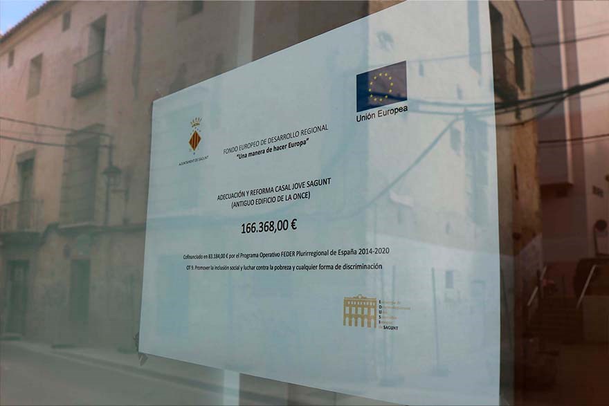 El edificio del nuevo centro Casal Jove, sito en la calle José Romeu, ha sido rehabilitado y adecuado a las necesidades actuales de los más pequeños y jóvenes, a través de la ayuda del Fondo Europeo de Desarrollo Regional (FEDER). El importe de las obras de esta rehabilitación integral del edificio asciende a la cantidad de algo más de 166.000 €, de los cuales el Fondo Europeo de Desarrollo Regional (FEDER), cofinancia el 50%, en el marco de la Estrategia de Desarrollo Urbano Sostenible e Integrado (EDUSI) “Join Sagunt” del Programa Operativo Plurirregional de España FEDER 2014-2020, y dentro del objetivo temático del programa “Fomento de la inclusión social y la lucha contra la pobreza y contra cualquier tipo de discriminación”.