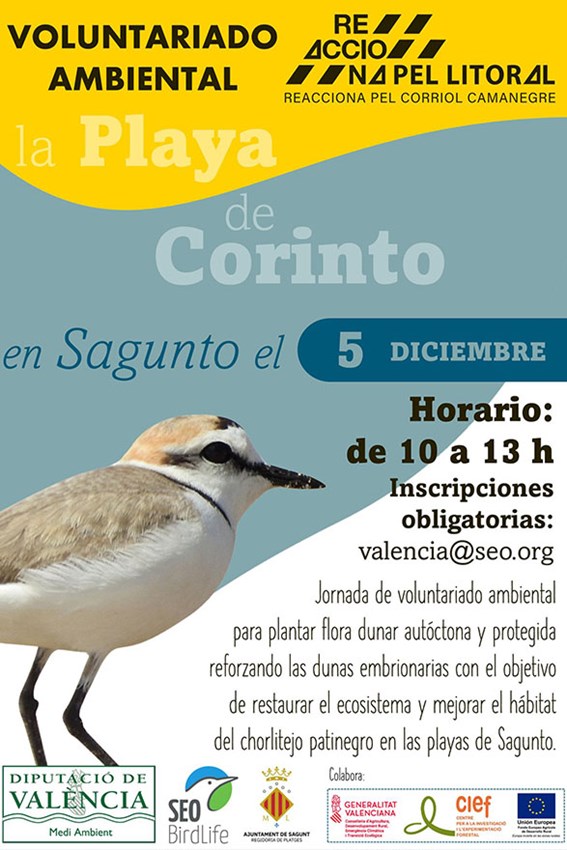El próximo domingo, 5 de diciembre, se realizará un voluntariado de limpieza en la playa de Corinto, en Almardá, a las 10 horas. El acto está organizado por la organización SEO BirdLife Comunitat Valenciana, en el que también colaboran el departamento de Playas del Ayuntamiento de Sagunto, la Diputación de Valencia y el Centre per a la Investigació i l'Experimentació Forestal (CIEF) de la Generalitat Valenciana.
