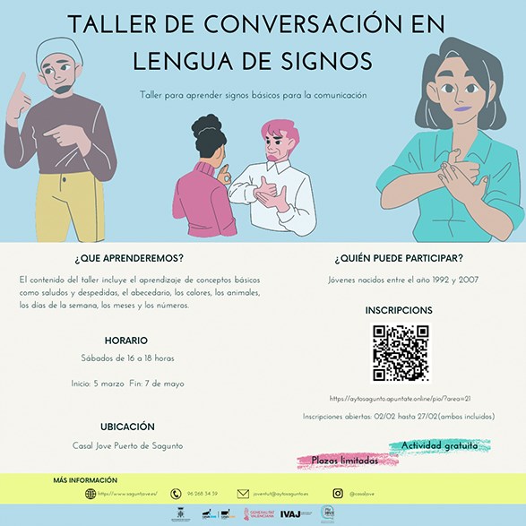 La Lengua de Signos Española (LSE) llega al Casal Jove de Puerto de Sagunto a través de un taller de conversación inclusiva. Con estas clases, que se impartirán los sábados de 16 a 18 horas y que empezarán el 5 de marzo y acabarán el 7 de mayo, el Casal Jove inicia sus acciones de ejecución del Pla Jove 2021-2025.