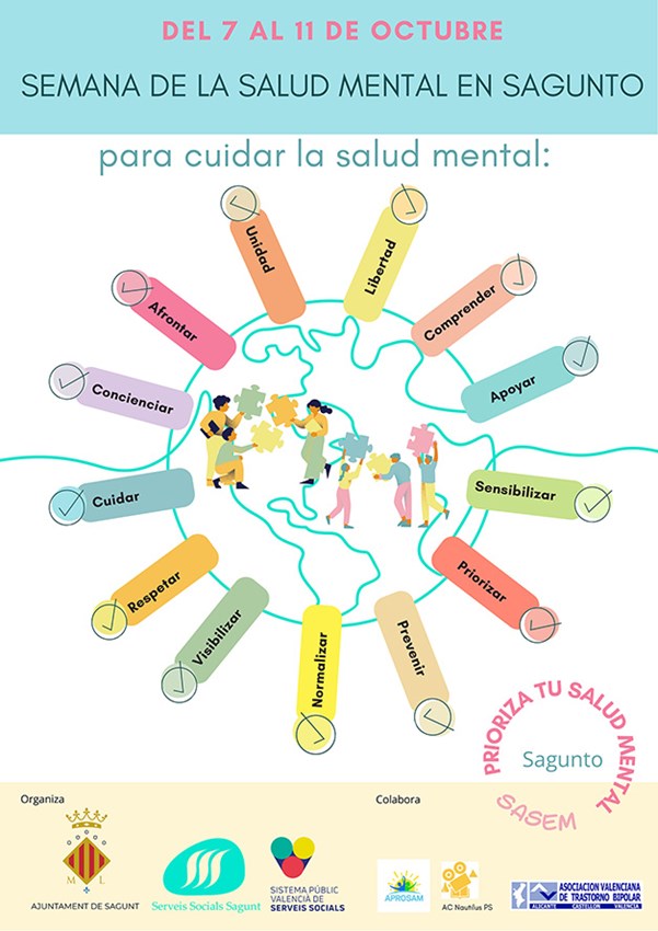 Según este departamento del Ayuntamiento de Sagunto, “concienciar, afrontar, unidad, libertad, comprender, priorizar, sensibilizar, apoyar, prevenir, normalizar, visibilizar, respetar, cuidar, son las palabras, la mayoría verbos, con que las personas que participan en el programa SASEM (Servicio de Atención y Seguimiento para la Enfermedad Mental) de los Servicios Sociales municipales han definido lo que es necesario para cuidar la salud mental. Verbos que se transforman en acciones que esperan de quienes les rodean y de la sociedad en su conjunto”.