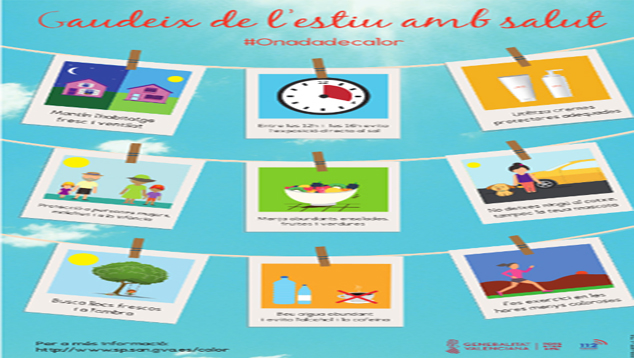La exposición a temperaturas excesivas puede provocar problemas de salud como calambres, deshidratación, insolación o golpes de calor. Para prevenir estos problemas la Conselleria de Sanidad Universal y Salud Pública ha publicado un programa con el objetivo de minimizar los efectos negativos que el calor excesivo tiene sobre la salud de la población, especialmente entre los colectivos más vulnerables, como los niños, las personas mayores, las embarazadas o las personas con enfermedades crónicas.