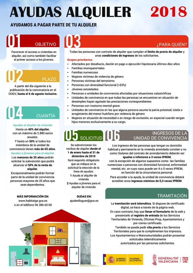 La Generalitat Valenciana ha abierto el plazo de presentación de solicitudes de ayudas al alquiler de vivienda, que estará abierto hasta el 6 de agosto (inclusive). El objetivo de las ayudas es favorecer el acceso a viviendas en alquiler, así como también facilitar el primer acceso a personas jóvenes.Las ayudas cubren hasta un 40% del alquiler con un máximo de 2.880 euros anuales, y hasta un 50% si todos los miembros de la unidad de convivencia tienen más de 65 años. También hay ayudas para jóvenes menores de 35 años, quienes podrán solicitar una subvención que podrá alcanzar hasta el 50% de la renta de alquiler. Excepcionalmente se aceptarán solicitudes de unidades de convivencia con personas mayores de 35 años que sean dependientes.