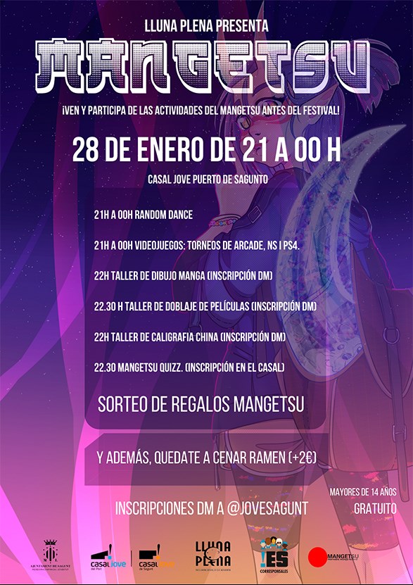 Como cada año, a lo largo de esta jornada nocturna que se celebra en el Casal Jove, se podrá disfrutar de manera anticipada de varias actividades que formarán parte del propio festival en las fechas establecidas. Entre estas actividades cabe destacar los talleres de dibujo manga, doblaje de películas y de caligrafía china, para los que será necesaria la inscripción previa a través de mensaje directo de Instagram a la cuenta @jovesagunt.