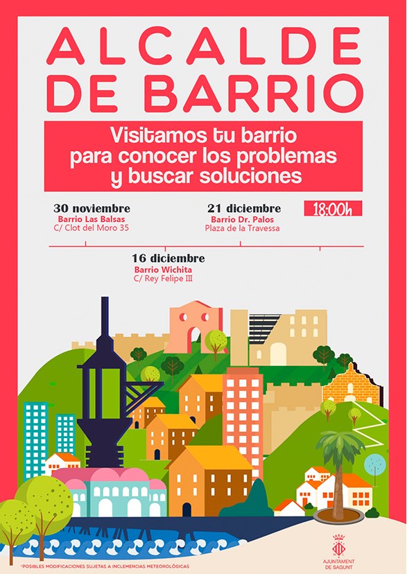 Alcalde de barrio es una idea, impulsada por el departamento de Participación Ciudadana y la Alcaldía del Ayuntamiento de Sagunto, que consiste en encuentros públicos por parte del alcalde con asociaciones ciudadanas, entidades y ciudadanía en general así como toda aquella persona que tenga interés en hablar sobre asuntos concretos del barrio que se visita.