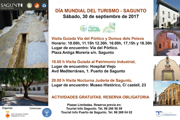 El Ayuntamiento de Sagunto, a través de la delegación de Turismo, celebrará el Día Mundial del Turismo el próximo sábado, 30 de septiembre. Para ello, se han programado distintas actividades, todas ellas gratuitas y la plaza se reserva mediante las Oficinas de Turismo.