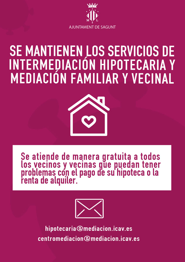 El departamento de Servicios Sociales del Ayuntamiento de Sagunto informa de que se mantienen los servicios de intermediación hipotecaria y mediación familiar y vecinal. Servicios Sociales continúa actuando como intermediario en este servicio, prestado por el Ilustre Colegio de Abogados de Valencia (ICAV), y atendiendo de manera gratuita a todos aquellos vecinos y vecinas que presenten problemas con el pago de sus hipotecas, renta de alquiler u otros problemas de mediación familiar, tal y como ha explicado el alcalde de Sagunto, Darío Moreno, hoy en rueda de prensa telemática.