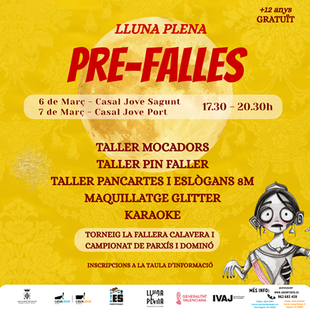 La Concejalía de Juventud e Infancia del Ayuntamiento de Sagunto ha organizado una actividad para la víspera de las Fallas 2026. Los centros juveniles de la ciudad albergarán el Lluna Plena Pre-Fallas los días 6 y 7 de marzo de 17:30 a 20:30 horas. Está dirigida a jóvenes mayores de 12 años y las actividades son gratuitas con inscripción previa en los mismos centros. El día 6 será en el Casal Jove de Sagunto y el día 7 en el de Puerto de Sagunto.