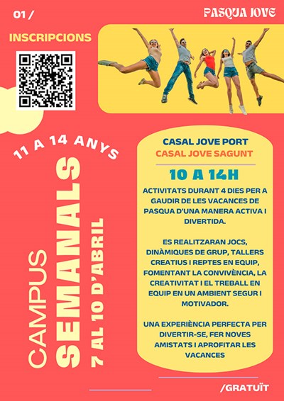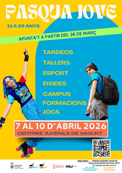 El departamento de Juventud del Ayuntamiento de Sagunto organiza una nueva edición de Pasqua Jove, una completa programación de actividades dirigida a jóvenes de entre 11 y 30 años que se desarrollará del 7 al 10 de abril en los Casals Joves de Sagunto y Puerto de Sagunto, así como en diferentes espacios del municipio y sus alrededores.