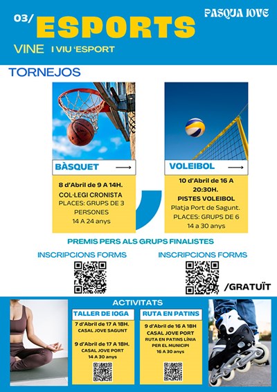 En lo que respecta a la segunda jornada, la del miércoles 8 de abril, se han programado en ambos Casals Joves sendos campus matinales de 10:00 a 14:00 horas para público de entre 11 y 14 años. Además, en el de Puerto de Sagunto habrá un torneo de Pokémon GO a las 17:00 horas, para un público de 11 a 30 años; un taller insproject inclusivo de 17:30 a 18:30 horas; y un tardeo dedicado a los videojuegos (PlayStation 5, Nintendo Switch y arcade) de 17:30 a 20:30 horas. Por otra parte, en el de Sagunto se ha previsto una formación sobre primeros auxilios de 17:00 a 21:00 horas para un público de 12 a 30 años; y un taller de transfer para gente de entre 11 y 30 años a las 18:00 horas. Asimismo, en el colegio Cronista Chabret de Sagunto se organiza un torneo de baloncesto a 3 de 9:00 a 14:00 horas para jóvenes de 14 a 24 años. Y desde la estación de tren se organiza una salida a Valencia de 9:00 a 14:00 horas con visita al Casco Histórico y al Centro de Cultura Contemporánea del Carmen, pensada para público de 11 a 30 años (cada persona se paga su billete de Cercanías).