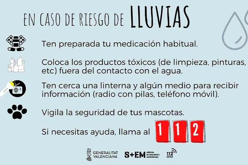 Davant possibles episodis de pluges intenses, se sol·licita a la ciutadania que extreme les precaucions i que, en tot cas, es mantinga informada dels avisos oficials de l'Ajuntament de Sagunt, AEMET i el 112, a més de seguir les següents recomanacions: