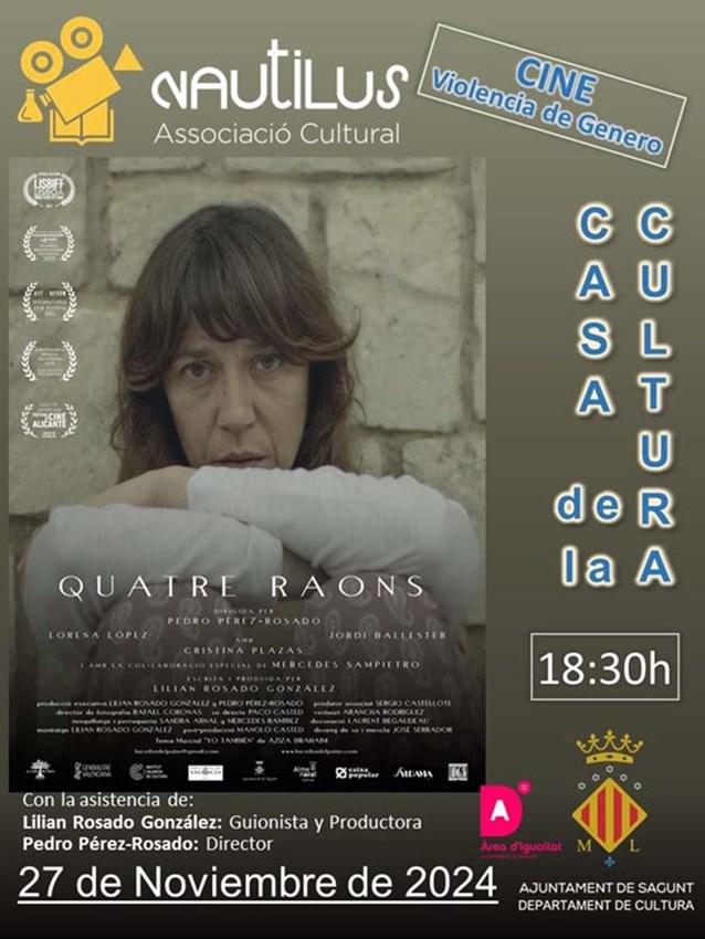 L'associació cultural Nautilus, en col·laboració amb les regidories de Cultura i Igualtat de l'Ajuntament de Sagunt, projectarà este dimecres, 27 de novembre, a les 18.30 hores la pel·lícula Quatre raons (2023) del director petresà Pedro Pérez Rosado.