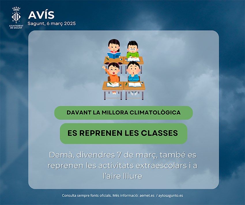 L'activitat escolar i educativa a tota la comarca del Camp de Morvedre es reprendrà amb normalitat demà, divendres 7. Així ho ha determinat el Grup de treball d'Emergències comarcal, en reunió de seguiment, tenint en compte que demà no es troba vigent cap avís per precipitacions intenses.
