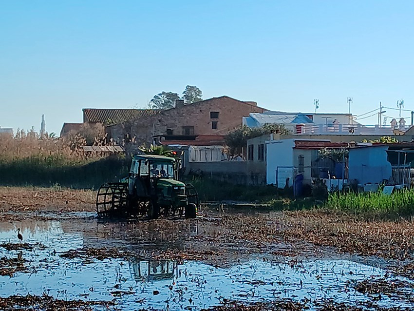 L'àrea de treball es troba inundada de manera intermitent, depenent de l'entrada dels fluxos d'aigua de l'aiguamoll. Per això, s'ha realitzat el desbrossament i fangueig amb maquinària específica de zones humides, a càrrec d'una empresa “de contrastada solvència”.