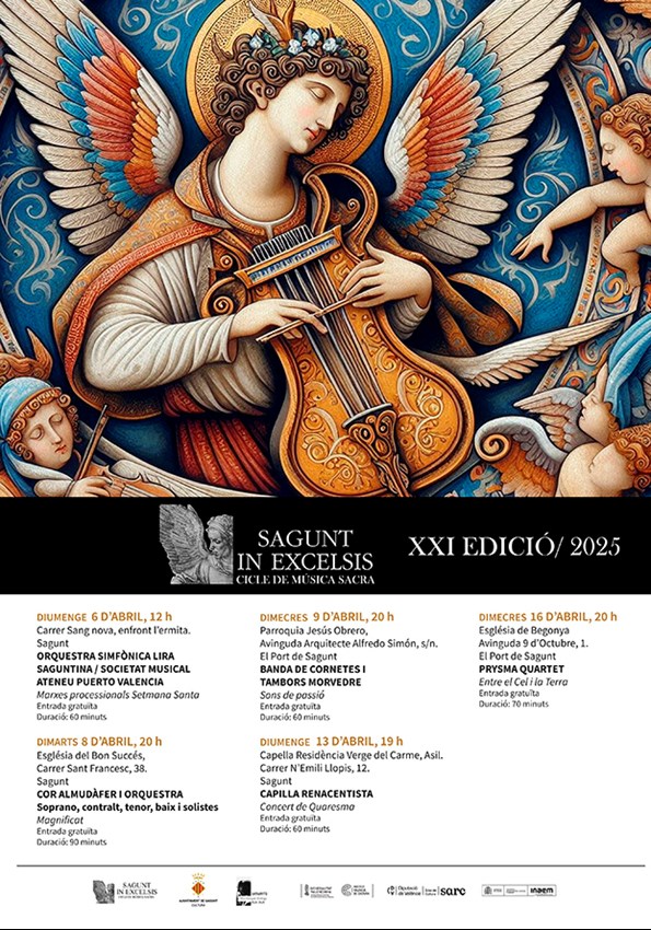 La XXI edició del cicle de música sacra Sagunt in Excelsis, que organitza la Regidoria de Cultura de l'Ajuntament de Sagunt, acaba demà, dimecres 16 d'abril. Serà amb el concert Entre el cielo y la tierra, a càrrec de Prysma Quartet, a les 20 hores a l'església Nostra Senyora de Begonya.