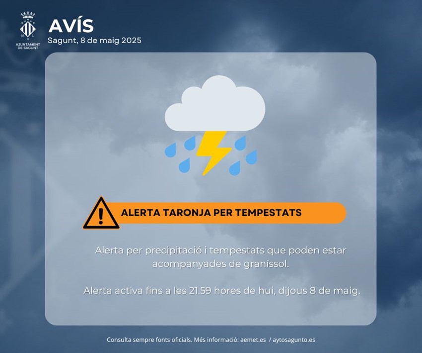 L'alerta per tempestats a Sagunt i en tot el litoral nord de la província de València s'ha elevat a nivell taronja (risc important) per part de 112 Comunitat Valenciana. L’alerta estarà activa fins a les 21.59 hores de hui, dijous 8 de maig.