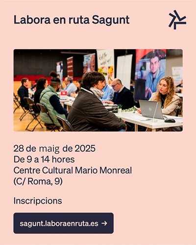 El Centre Cultural Mario Monreal de Sagunt albergarà dimecres que ve 28 de maig el fòrum d'ocupació ‘Labora en ruta’, de 9 a 14 hores. Este esdeveniment està organitzat per Labora amb la col·laboració de l'Ajuntament de Sagunt i l'Acord Territorial per al Desenvolupament Local i l'Ocupació del Camp de Morvedre.