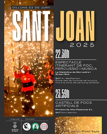 La Regidoria de Festes i Cultura Popular ha preparat una programació amb focs artificials, batucada i un correfoc per a la nit del dilluns 23 de juny. Des de les 22.30 hores fins a la mitjanit en l'avinguda Mediterrani – des de la rotonda de l'àncora fins a l'aparcament asfaltat – es desenvoluparà un espectacle itinerant de foc, percussió i música a càrrec de La Diabòlica de Morvedre i la batucada Green Gos. I a les 23.59 hores es dispararà un castell de focs artificials en el port marítim, a càrrec de Pirotecnia Alto Palancia SL.