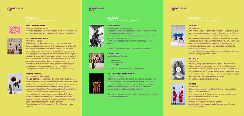 Fem(me) Dansa continuarà el dissabte, 26 de juliol, a partir de les 20 hores, amb els següents tres espectacles de dansa: Solastalgia (20 minuts) d'Ana Erdozain i Alba González, Game Over (20 minuts) de Noelia Sánchez Gómez i No hay hueco en el jardín (11 minuts) d'Elena Puchol Sola.