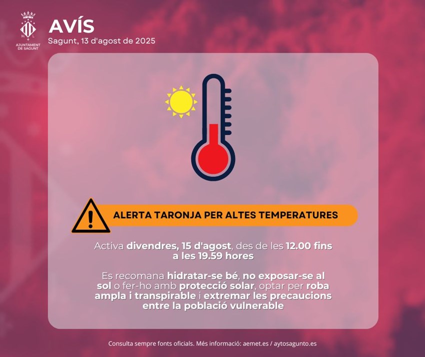 L'alerta per calor extrema, derivada de l'onada de calor que afecta Sagunt i el litoral nord de la província de València, s'ha elevat a nivell taronja (risc important) per part del 112 Comunitat Valenciana. Esta alerta estarà activa des de les 12 fins a les 19.59 hores del divendres, 15 d'agost.