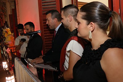 El pregó s'ha desenvolupat en el Consistori amb la presència també de l'alcalde de Sagunt, Darío Moreno; la regidora de Festes i Cultura Popular, Patricia Sánchez; el president de l'Associació de Moros i Cristians de Sagunt, Patrick Salvador; altres regidors i regidores de l'Ajuntament de Sagunt; el comissari de la Policia Nacional; el president i les falleres majors de la Federació Junta Fallera de Sagunt (FJFS); el president i la responsable de protocol de l'Associació Cultural de Penyes de les Festes Patronals de Sagunt, Ricardo Meliá i Anaïs Aparicio respectivament; representants de la Federación de Peñas Puerto de Sagunto així com de la Majoralia de la Confraria de la Puríssima Sang del Nostre Senyor Jesucrist.