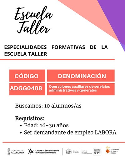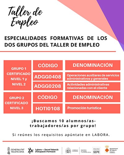Este taller està format per dos especialitats formatives, per la qual cosa es dividix en dos grups. El primer, sobre servicis administratius (Grup 1) i, el segon, sobre promoció turística (Grup 2). L'objectiu és que cada grup estiga integrat per 10 persones que complisquen els següents requisits: tindre més de 16 anys, ser persones desocupades i estar inscrites en una oficina d'Espai Labora, tindre un perfil de LABORA tenint sol·licitades les especialitats del Taller d'Ocupació que li interessen.