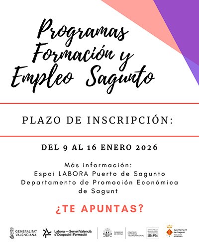 L'Ajuntament de Sagunt, a través de la Regidoria de Promoció Econòmica, ha aconseguit dos subvencions per un total de 813.212 euros de la Conselleria d'Educació, Cultura, Universitats i Ocupació (LABORA Servici Valencià d'Ocupació i Formació). Concretament, ha sigut beneficiari de dos programes mixtos de formació i ocupació que es posaran en marxa al llarg de 2026 i finalitzaran en el 2027. D'una banda, està el Taller d'Ocupació Impulsant Sagunt IV, que compta amb una subvenció de 565.384 euros. I, d'altra banda, es troba el Taller Som formació Sagunt II, amb una subvenció de 247.827 euros.